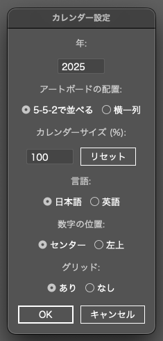 12ヶ月分のアートボードを自動生成日本語・英語の2言語対応日本の祝日を自動でレイアウト